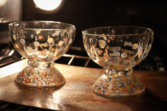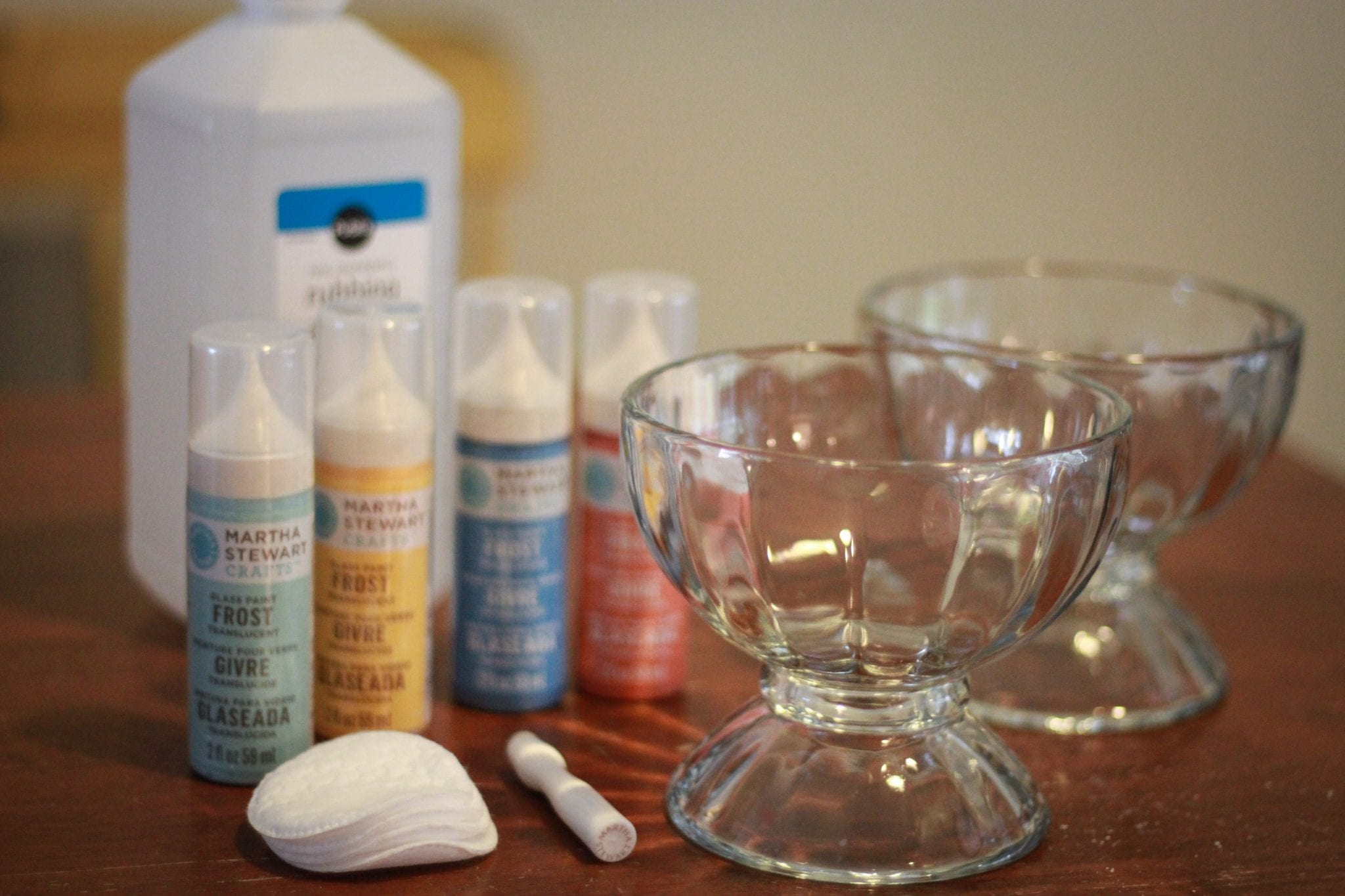 So, I had been on a hunt to find something cute to use with Martha Stewart Craft’s new line of glass paint and at my local thrift store, I stumbled upon these two cute dessert looking glass bowls for $1 each!! How could I pass that up!! I brought the bowls home gave them a good washing and wiped them down with alcohol then I got to work!