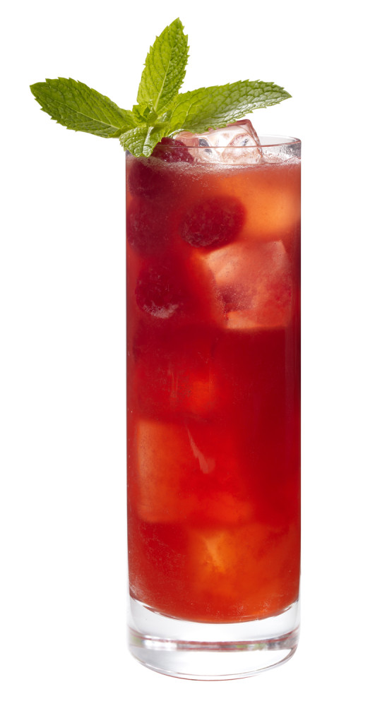 Muddle mint leaves, watermelon and raspberries in cocktail shaker. Add rum, lime juice and simple syrup with ice. Shake vigorously to infuse mint flavor well. Strain into highball glass over fresh ice. Top with soda and garnish with a sprig of mint.