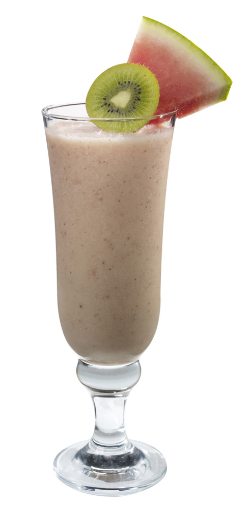 Place all ingredients in blender, saving one kiwi slice for garnish. Blend until completely smooth. Pour into goblet. Garnish with kiwi and watermelon slice.