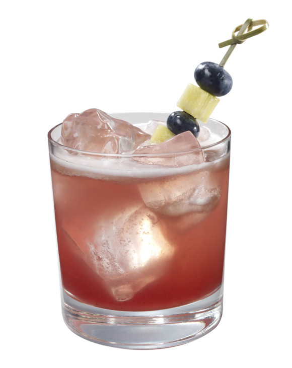 Muddle basil leaves, pineapple and blueberry in cocktail shaker. Add rum, lemon juice and simple syrup with ice. Shake vigorously to infuse basil flavor well. Strain into large rocks glass over fresh ice. Garnish with pineapple and blueberries.