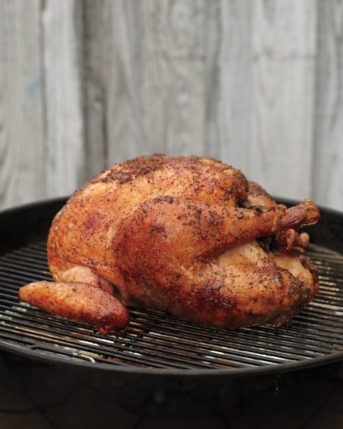 Visit our step-by-step photo tutorial for this recipe. You will need a kettle grill with a lid that’s at least 22 inches in diameter, such as a Weber. You will also need a chimney starter, trussing supplies, a bag of best-quality charcoal briquettes, and a disposable heatproof aluminum roasting pan.