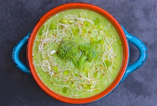 The avocado gives this soup its creaminess, and raw broccoli gives it just the right crunch. Take 1 bunch of broccoli, half an avocado, the juice of 1 lemon, a small bunch of green onions, a clove of garlic, and 1 cup of water and blend it in a blender. Puree, season with salt and pepper and stir in 2 tablespoons of olive oil. Chill for several hours, and serve topped with a few finely chopped broccoli florets, some sprouts, and chopped green onions. You’ll be amazed at the difference in flavor of this soup.