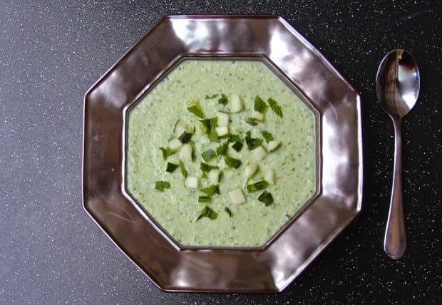 This is one of the most refreshing soups you’ll eat, and it’s perfect as a summer starter on the back patio. Take 2 cucumbers, cup of plain yogurt, juice of 1 lemon, a small onion roughly chopped, one clove of garlic, and a small bunch of mint and blend it in a blender. Add 1/4 cup of water and a tablespoon of olive oil. Blend until smooth, and season with salt and pepper. Chill for a few hours, and serve topped with additional chopped cucumbers and chopped mint leaves. This one will definitely become a summer favorite.