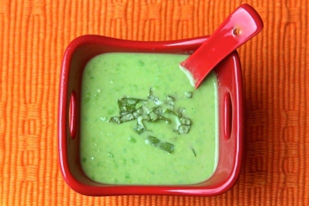 This bright green soup not only looks great, it tastes great too! To make it, put 4 cups of chicken stock and 2 cups of shelled green peas in a pot with half an onion that has not been chopped. Bring to a boil. Simmer for 5 minutes, remove the onion and season with salt and pepper. Transfer to a blender and blend with 1/2 cup plain yogurt and a small bunch of basil leaves. Chill well and serve topped with more basil.