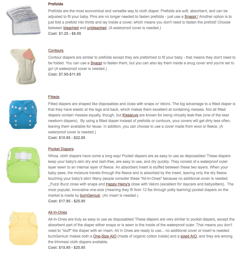Try to find a store like Jasmine or a friend that you can actually go to and see and touch the diapers. This is the best way. Don’t worry about how many different styles and types there are and all the rules and stuff. There is so much information on the internet that it will actually make you insane. Find a style you like or do the diaper trial (I did Jillians drawers trial) and go from there.