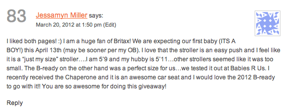 Note: When the winner is chosen, their information will be given to Britax. The prize stroller will not be shipped until first week in April upon to it’s release.