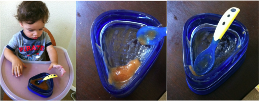 The Baby Dipper is a triangular-shaped bowl that enables one-handed feedings of infantry and makes self-feeding easy for toddlers.