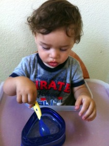 When the food was all done, my son decided he wanted to try and learn all about using a spoon. Which I might add, he has actually never shown any interest in doing so before, so I would like to think the Baby Dipper helped encourage this.