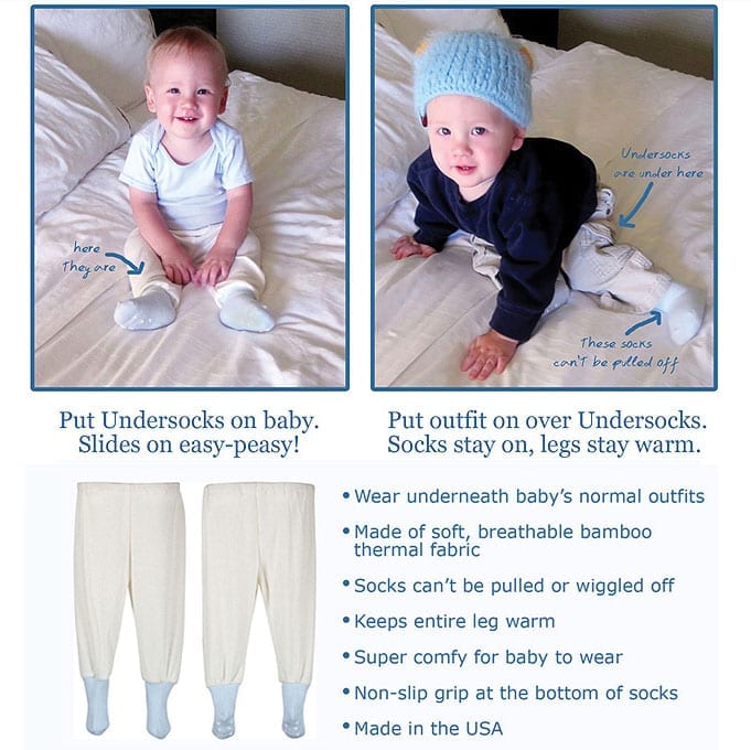 …that’s a lot of pieces to put on a baby, especially all together. In the winter time, I know one of the most important things for you is to keep your little bundle safe and warm. Imagine my surprise when I stumbled upon Baby Undersocks. Cute and perfect! They are plushy socks that have been sewn into the bottom of bamboo thermal underpants. Amazing.