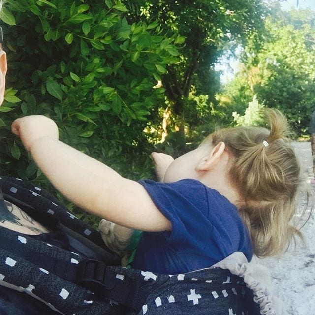 This is called the “twist”, it’s where she turns her body so much that we have to put her down. We get fooled into thinking she wants to walk graciously beside us until she takes off and runs away. Pretty sure she is pulling some leaves and branches here so I fall over and she can escape.