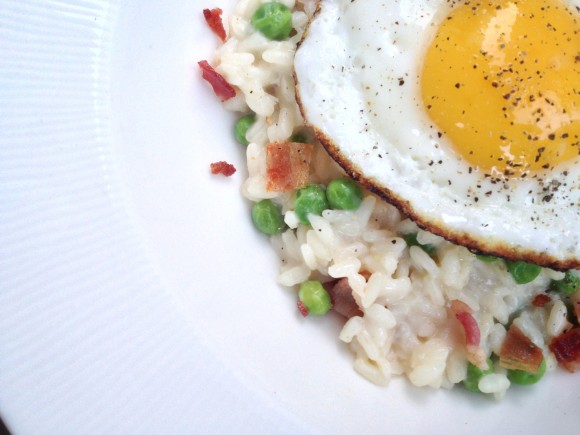 I waited a long time to try to make risotto at home, and it wasn’t until my supermarket had a sale on arborio rice that I decided now is the time. Risotto just always sounded so intimidating, and after watching a lot of shows on Food Network, I had seen and heard of a lot of risotto horror stories. However, making risotto is a surprisingly simple process that just requires a bit of stirring for a delicious payoff. There are lots of variations of risotto out there, using everything from squid ink to saffron, but this recipe comes from kitchen staples you probably have on hand. A lowly bag of frozen peas, some bacon, and some eggs all come together to make an easy one dish meal.