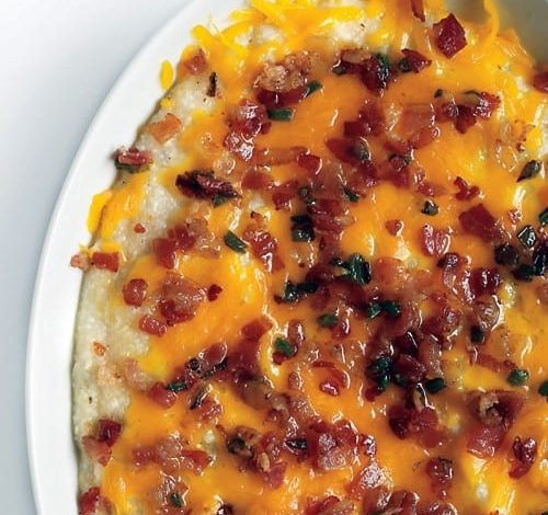 2. Bring liquid to a boil over high and whisk in 1 cup quick-cooking grits. Whisk until mixture begins to thicken, then reduce heat to low and gently simmer, stirring occasionally to prevent sticking, 25 minutes or until creamy. Season with coarse salt and ground pepper. Whisk in 1 cup grated sharp cheddar (2.5 ounces) and three-fourths the bacon mixture. Pour into a 2-quart serving dish and top with 1/2 cup cheddar (1.5 ounces) and remaining bacon mixture. Serves 4.