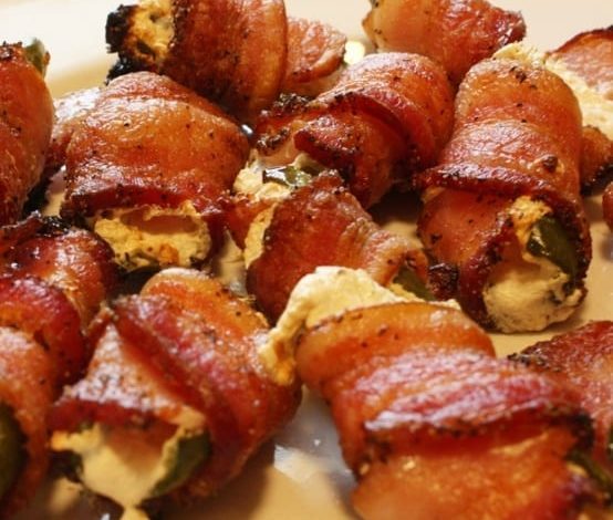 Tightly wrap one half-slice of bacon around each pepper. Arrange peppers on a coated baking sheet and bake for about 15 – 20 minutes, until the bacon is cooked and crisp and the filling is bubbling.