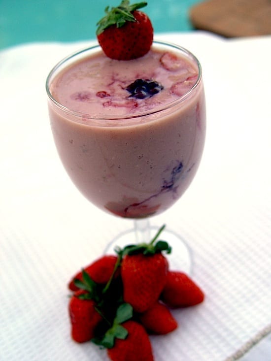 Trim the strawberries, discarding the stems and rinse blueberries & strawberries quickly until running cold water. Combine all ingredients in a blender and blend until a thick smoothie forms.