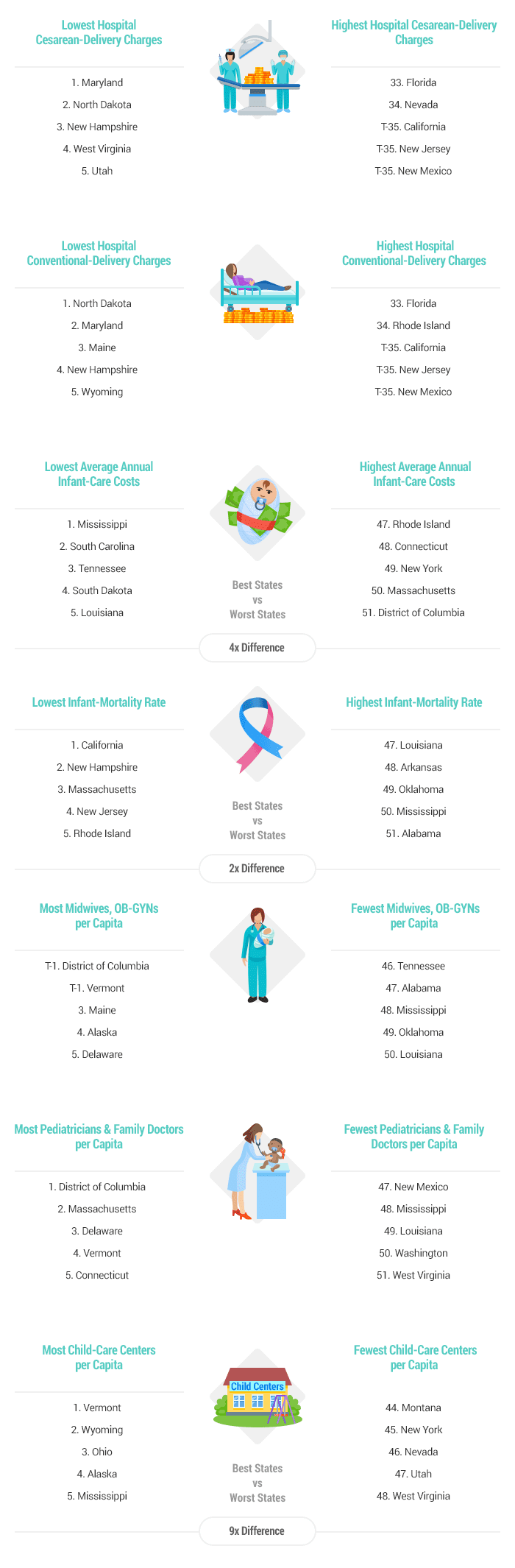 To give expectant parents an idea of the delivery costs, health-care accessibility and baby-friendliness of each state, analysts compared the 50 states and the District of Columbia across 17 key metrics. Our data set ranges from “hospital Caesarean-delivery charges” to “annual average infant-care costs” to “number of pediatricians per capita.”