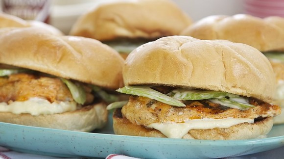 When ready to prepare, preheat grill to medium-high heat. Remove chicken from marinade and cook until just cooked through, about 3 to 5 minutes a side. Toast buns and spread mayonnaise mixture on each bun; top with chicken and a generous helping of celery slaw.