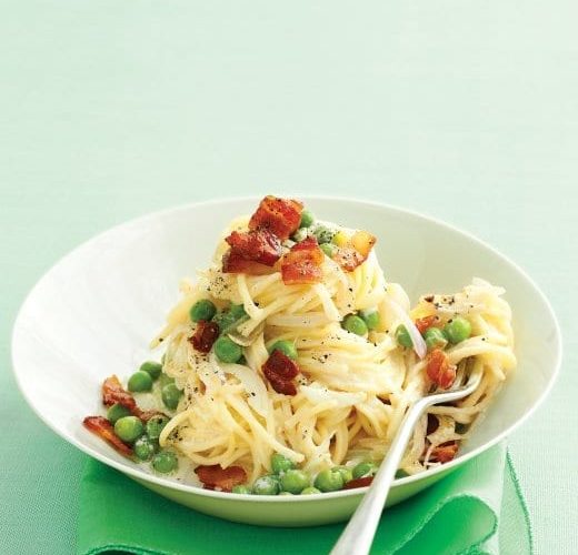 FEATURED Dinner Everyday Food & Drink Recipes Fresh Angel-Hair Pasta with Bacon and Peas by Modern Day Moms on October 24, 2013 FEATURED In our take on pasta alla carbonara, bacon substitutes for pancetta, and shallots and peas are… Read More