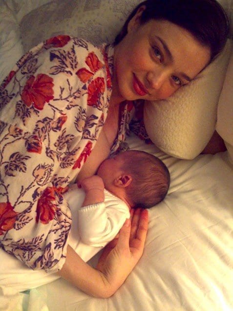 Victoria’s Secret model Miranda Kerr and her handsome hubby Orlando Bloom welcomed their first child in January 2011. The model mom tweeted a gorgeous photo of her and baby Flynn, then 3 months. “Another day in the office,” the new mom wrote, sharing a photo of herself in full hair and make-up at a photo shoot breastfeeding her adorable babe.