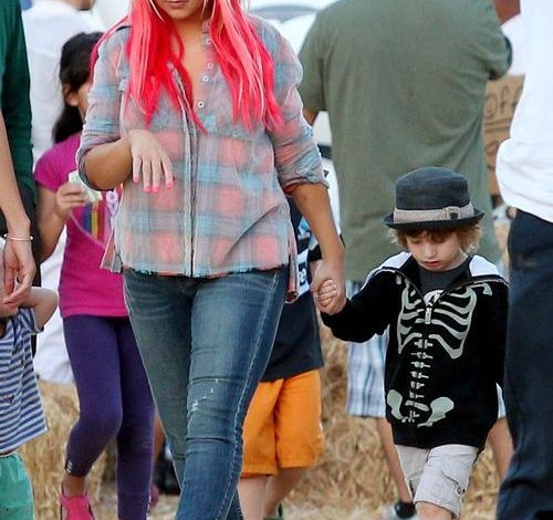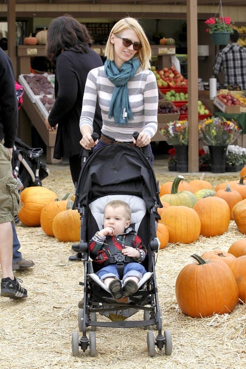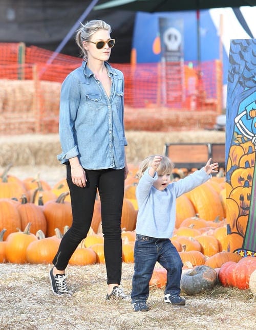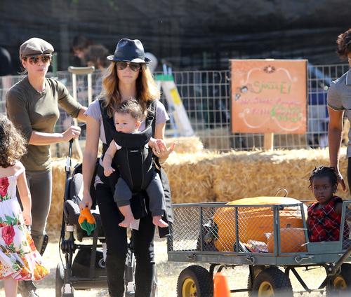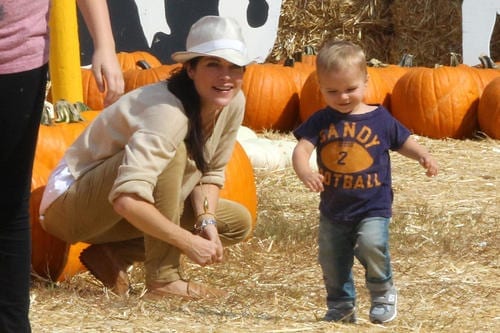 The adorable 14-month old gleefully ran around some of the pumpkins with his mama chasing him followed by some downtime while he checked out the red wooden pony. The tot then went on real pony ride with the doting Anger Management actress by his side.