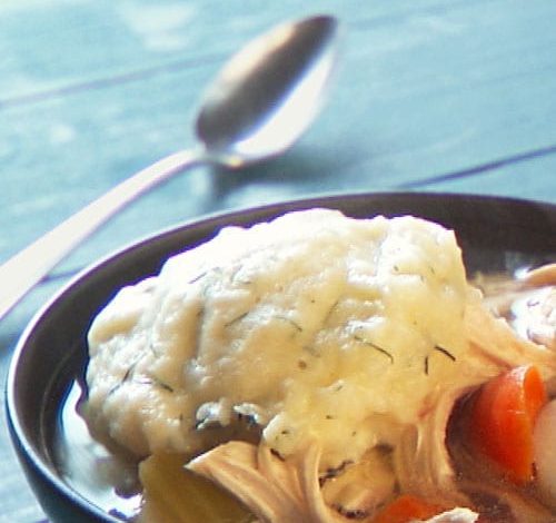 Drop the dough, 1 tablespoon at a time onto the simmering broth. Cover and cook until the dumplings have cooked through 3 to 4 minutes. Carefully return the shredded chicken and the vegetables to the pot. Reheat for 1 minute. Serve in wide bowls with big spoons.