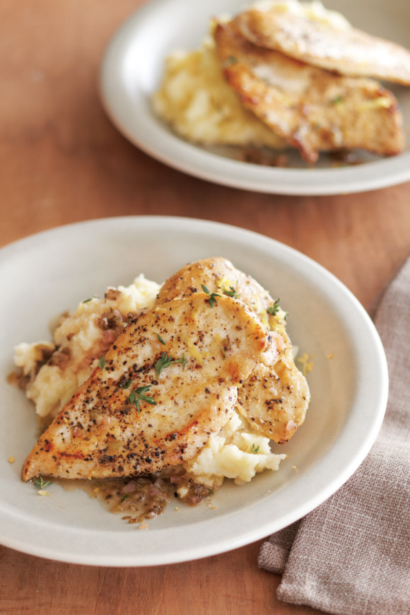 Love the simplicity of this dish: thin chicken cutlets are quickly sauteed, and then a quick pan sauce is created by cooking together fresh herbs, tart lemon juice and hot chiles. Serve with mashed potatoes and sauteed savoy cabbage.