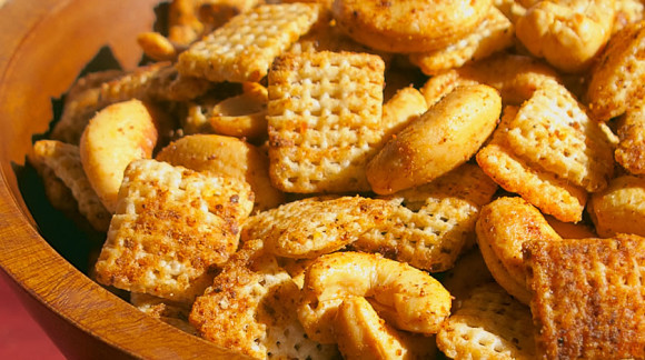 Melt butter in 2-quart saucepan over low heat. (Or microwave in large glass bowl.) Stir in TABASCO Chipotle Sauce, chili powder and salt until combined. Stir in cashews and cereal squares until well mixed.