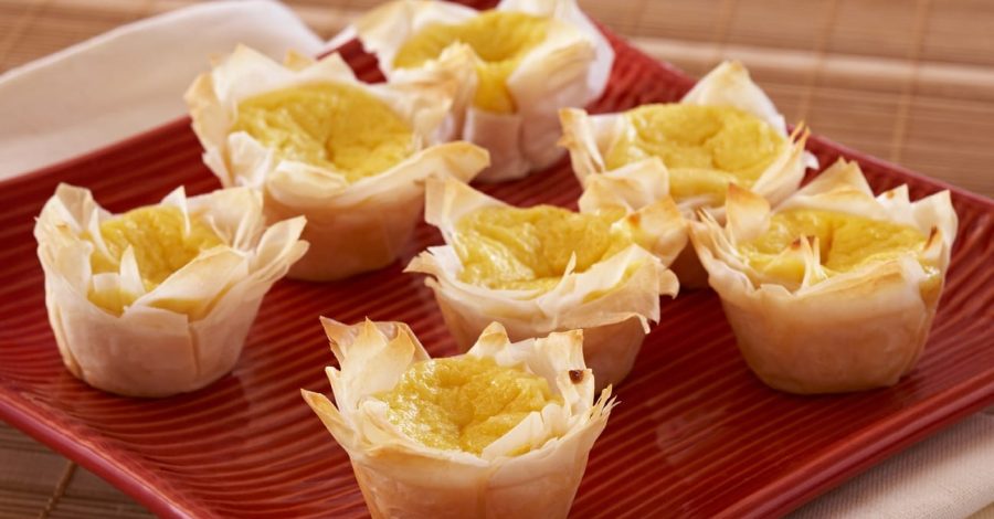 Fill each phyllo cup with custard about 1/8 in. from the top of the crust. Bake at 375 degrees for approximately 20 minutes.