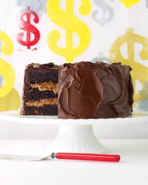 Layers of chocolate cake get stacked with luscious caramel sauce, crisped-rice crunch, and a rich chocolate frosting for this fully loaded indulgence.