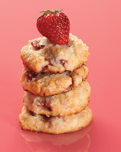 These tender cookies are made with cream and studded with sweet strawberries for a portable version of a classic dessert.