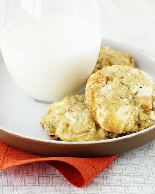 A glass of milk is the ideal accompaniment to these drop cookies. Besides white chocolate, the cookies are also chockablock with oats, coconut, golden raisins, and walnuts.