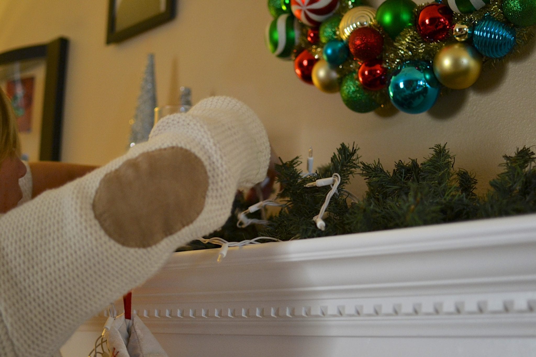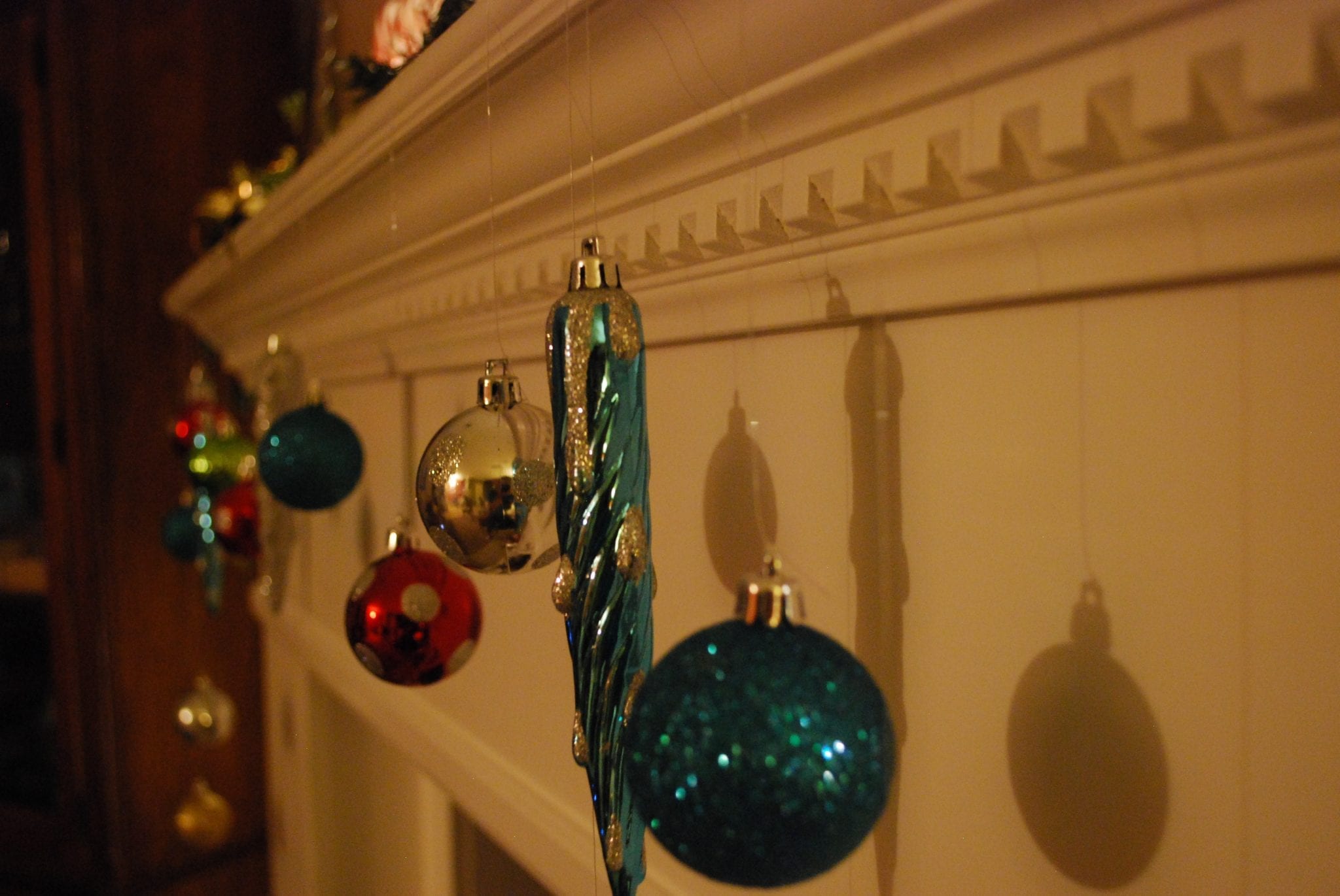 Another idea we talked about was to hang the shatterproof ornaments by fishing wire. You can hang them from a window or on a mantel like below: