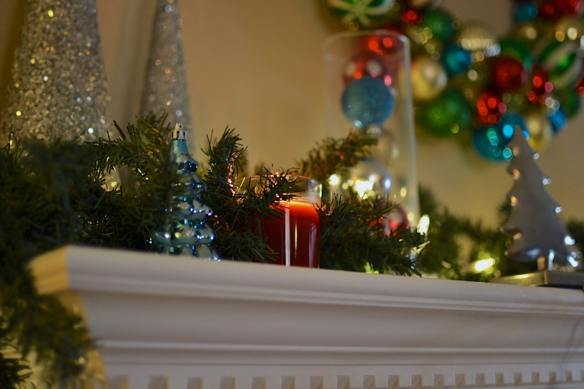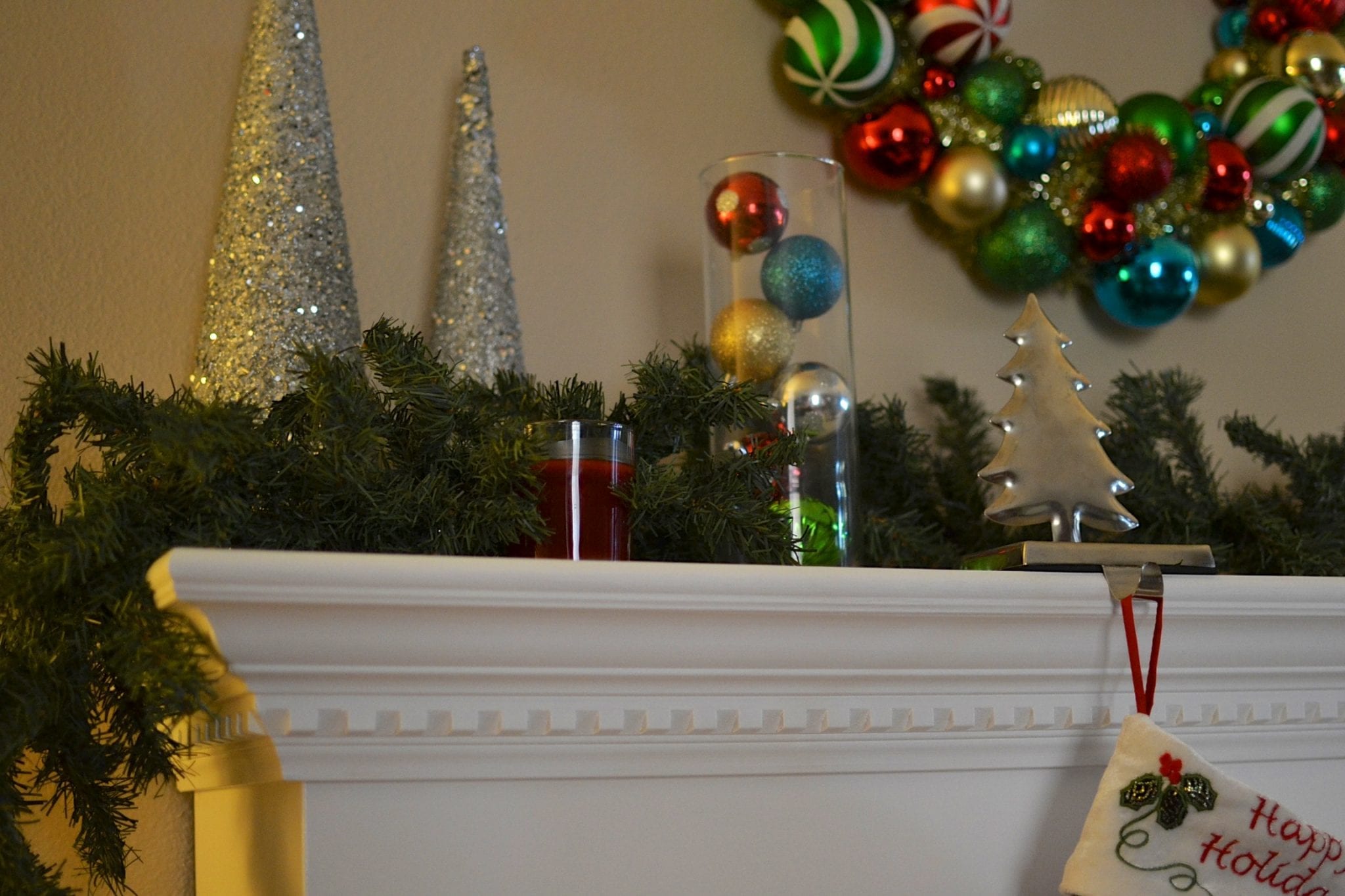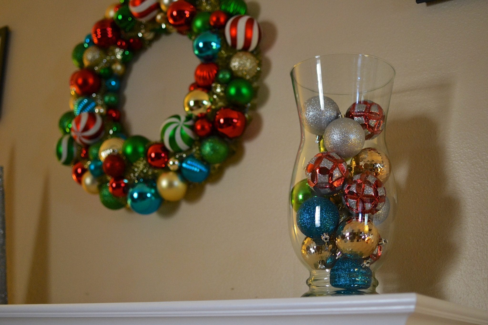 One of my favorite things to do is to display decorations in large clear vases, I think it’s a versatile way to display different decorations for each season. We were talking about even throwing some easter eggs in the vase around March or some acorns & pine cones once autumn rolls around… For this project, I thought the shatterproof ornaments would look great.