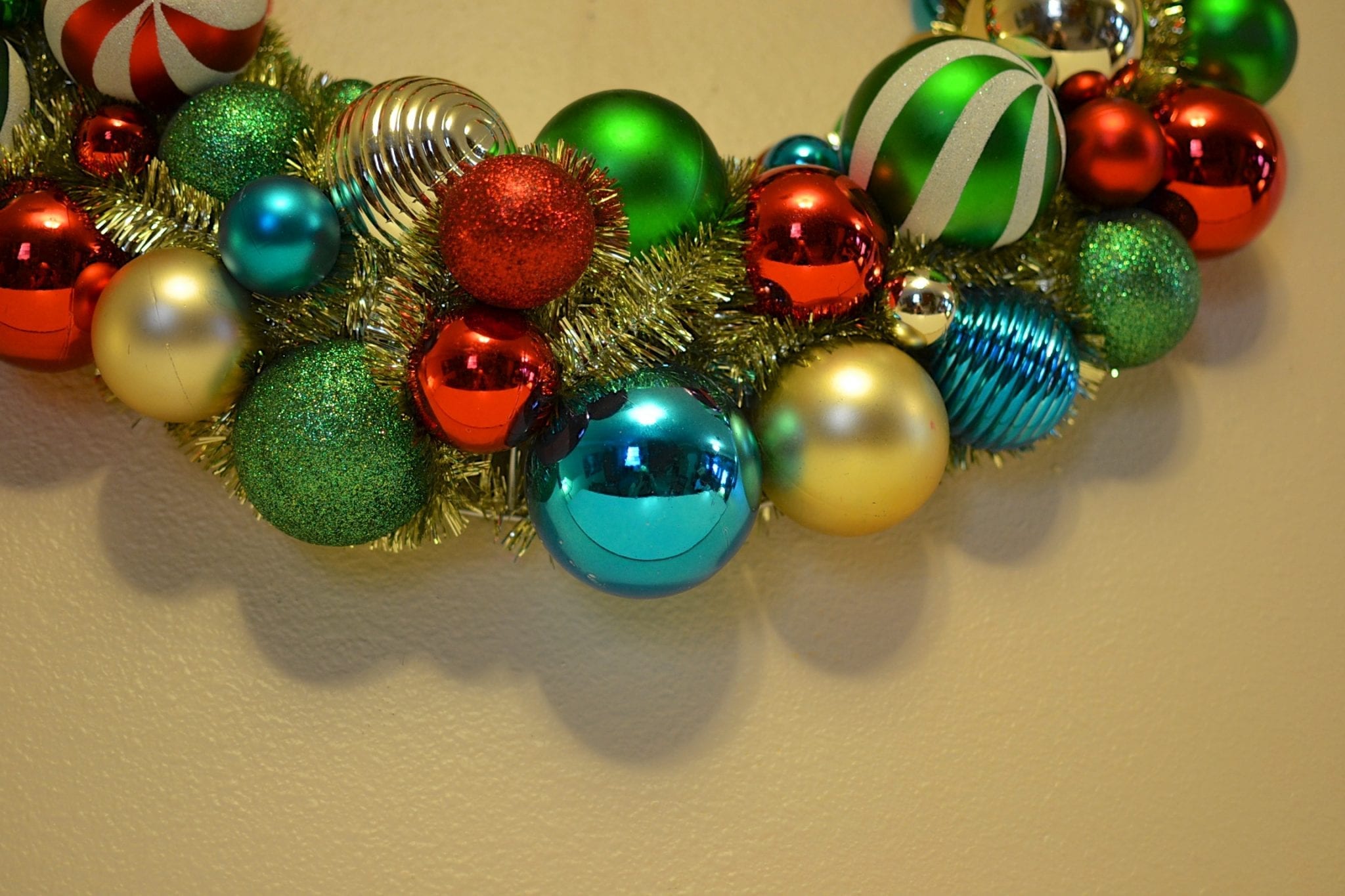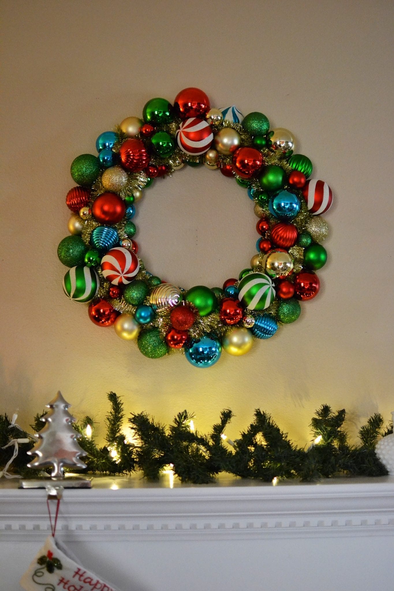 – Martha Stewart Living Christmas Collectibles 24 in. Ornament Wreath in Red, Green, and Blue Colors (this was also shatterproof!)