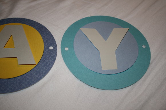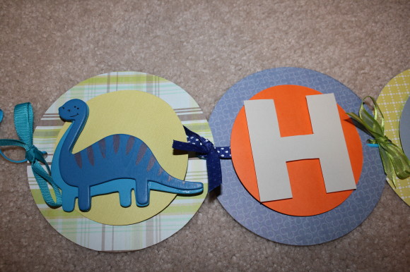 Using the 3-D double sided adhesive foam squares, attach the small circles to the big circles and the letters to the small circles. Also use them to attach your picture or design. I happened to find these wood dinosaurs, already painted in colors that matched (score!!!) at Joanne. They were a little heavy because of the wood accents, but I just tied them extra tight when we hung them.