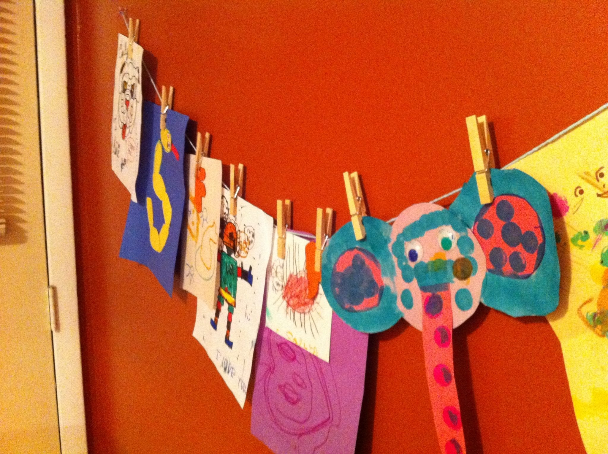 I gathered some clothes pins (97 cents for 50 at Walmart), yarn and 2 clear thumb tacks. I made a “clothes line” to hang the art, I tied the yarn into a knot around each end of the thumb tack and lined it up.