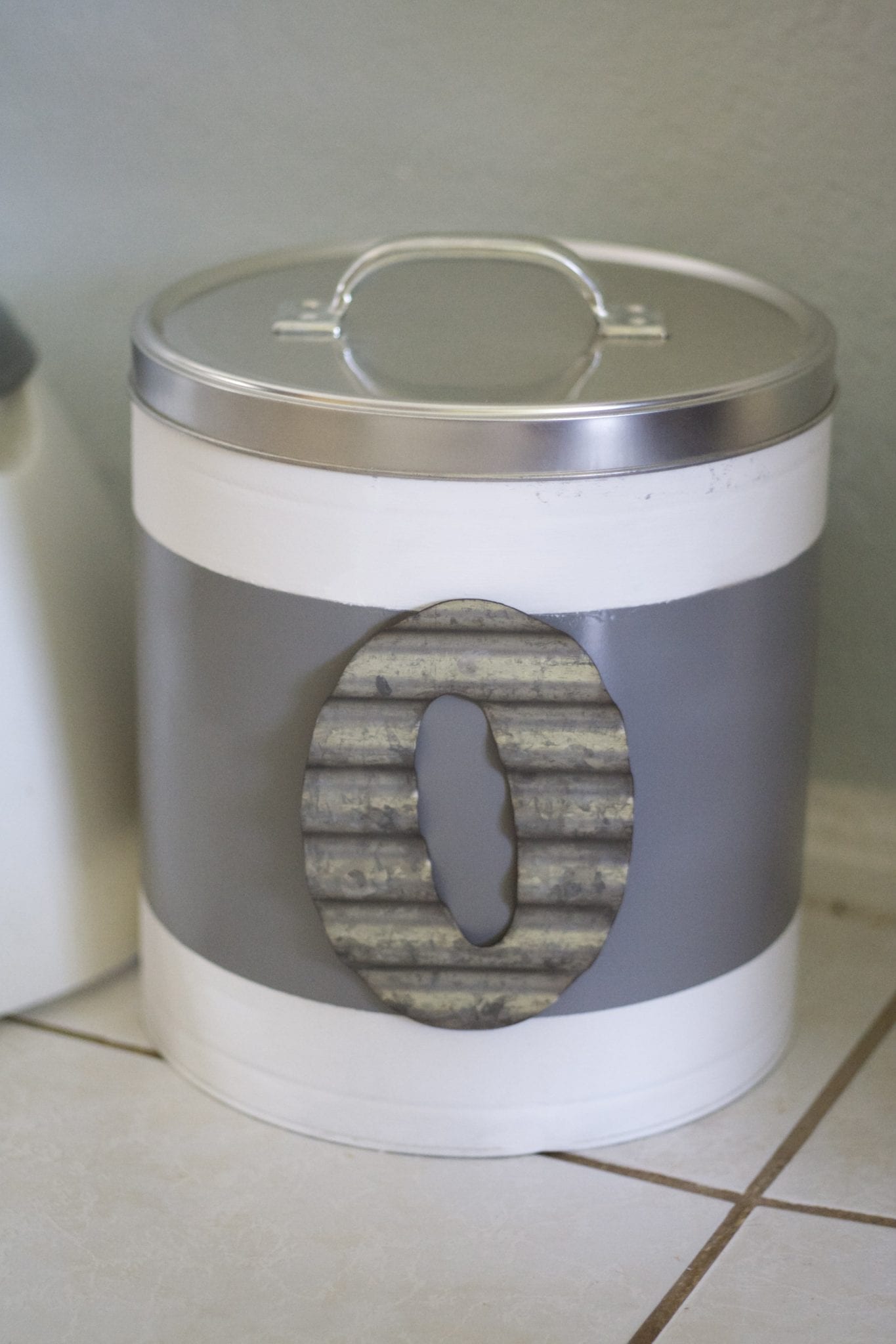These dog food tins have become ever-so popular in the Pinterest community. I’ve seen them in stores anywhere from $25-40 for an average sized one. The one I have is a popcorn tin saved from Christmas. You can find empty tins in hardware stores as well, but you might wind up spending as much as you would purchasing a dog food tin already made.
