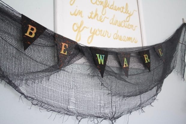 Halloween is coming up soon, but there is still plenty of time to make this festive banner! It is so easy and inexpensive to make. Here is how: