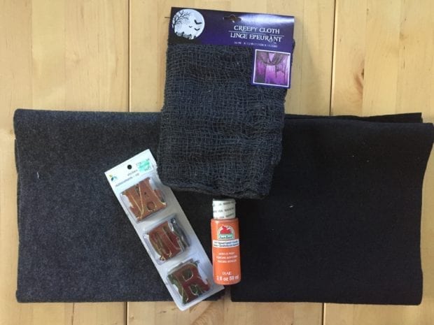 The jute and felt were purchased at Joann. The paint was from walmart. The letters were purchased at Hobby Lobby in the scrapbooking section and are made by Momenta. And finally, the creepy cloth was purchased at Dollar Tree.