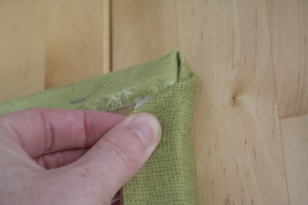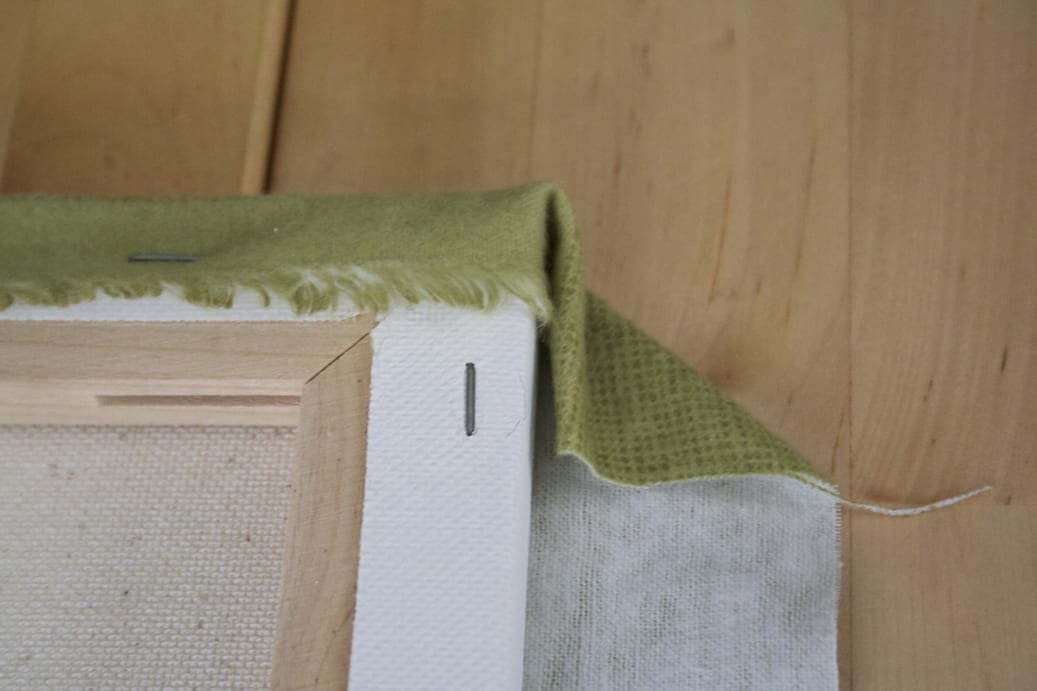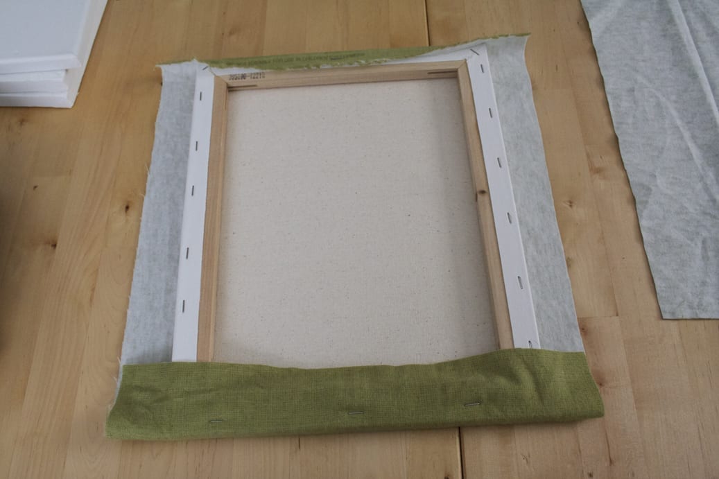 First, smooth out your fabric onto a tabletop facing down and lay your canvas over it. Pull one end up and staple it to the back side of the canvas. Make sure if you have patterns that the canvas is aligned with those so they won’t be wonky when you are done. Do this to both ends.