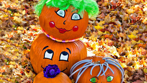 Add fun accessories to the painted pumpkins — such as earrings made out of rubber slip joint washers, a wig made out of caulking rod, and a necklace made by stringing disposable earplugs (found in the hardware department) together with a needle and thread.