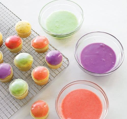 Syrups made with fresh blueberries, strawberries, and mint make these pastel icings look as good as they taste. Simply stir confectioners’ sugar into syrup to reach the consistency of honey. Then dip cupcake tops into icing, or pipe it onto sugar cookies.