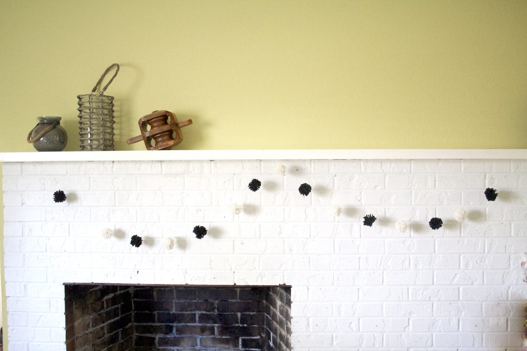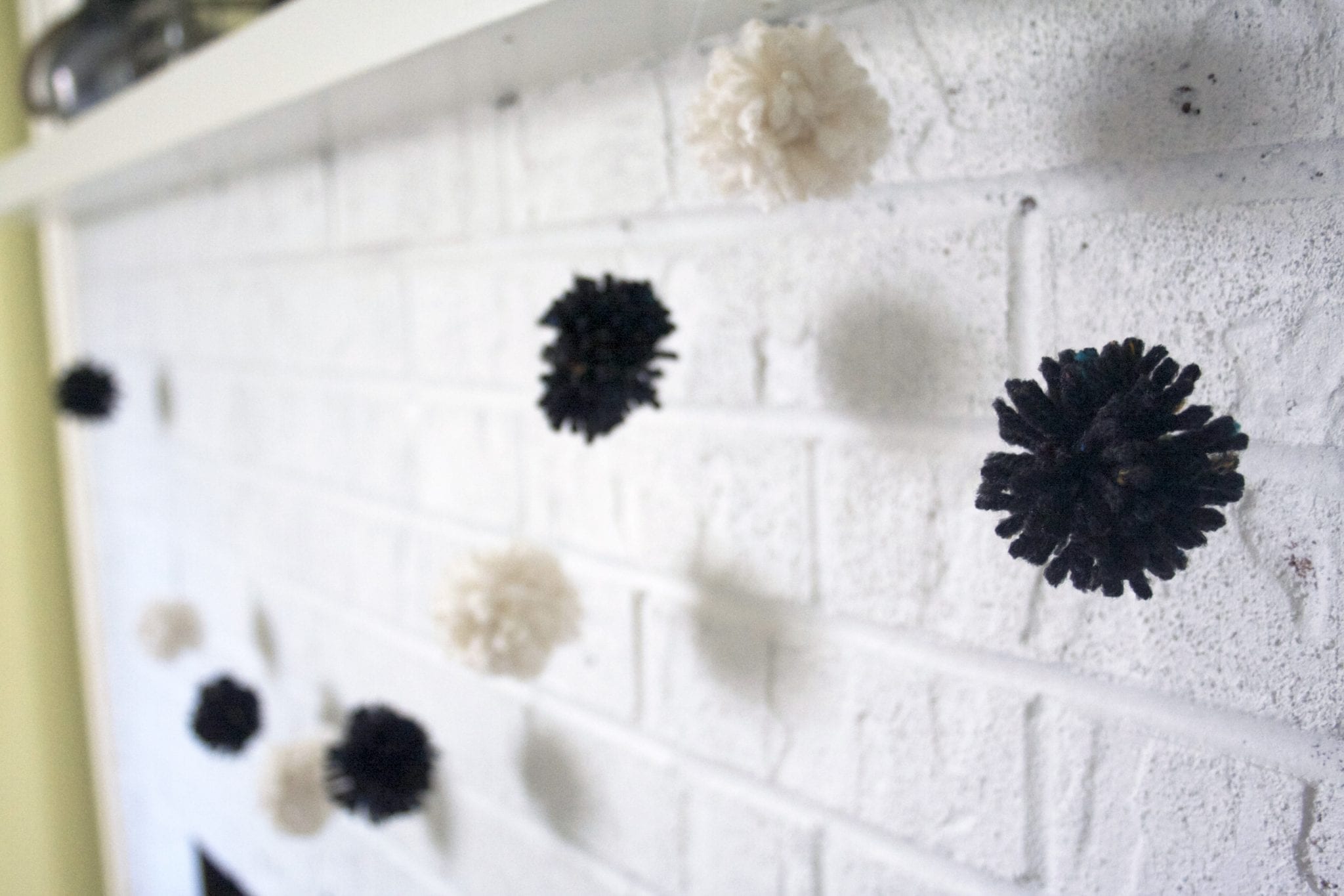 Once you have enough poms to string, feed your threaded needle through the center of the pom, then loop it around and feed it through the pom again before adding the next one. This will create a cradle for each pom so that they don’t slide down while they are hanging, but you can still move them around to even them out…or to un-even them out, if that’s what you like. Tie loops in each end of the thread so that you have a loop to hang it from. You’re done!