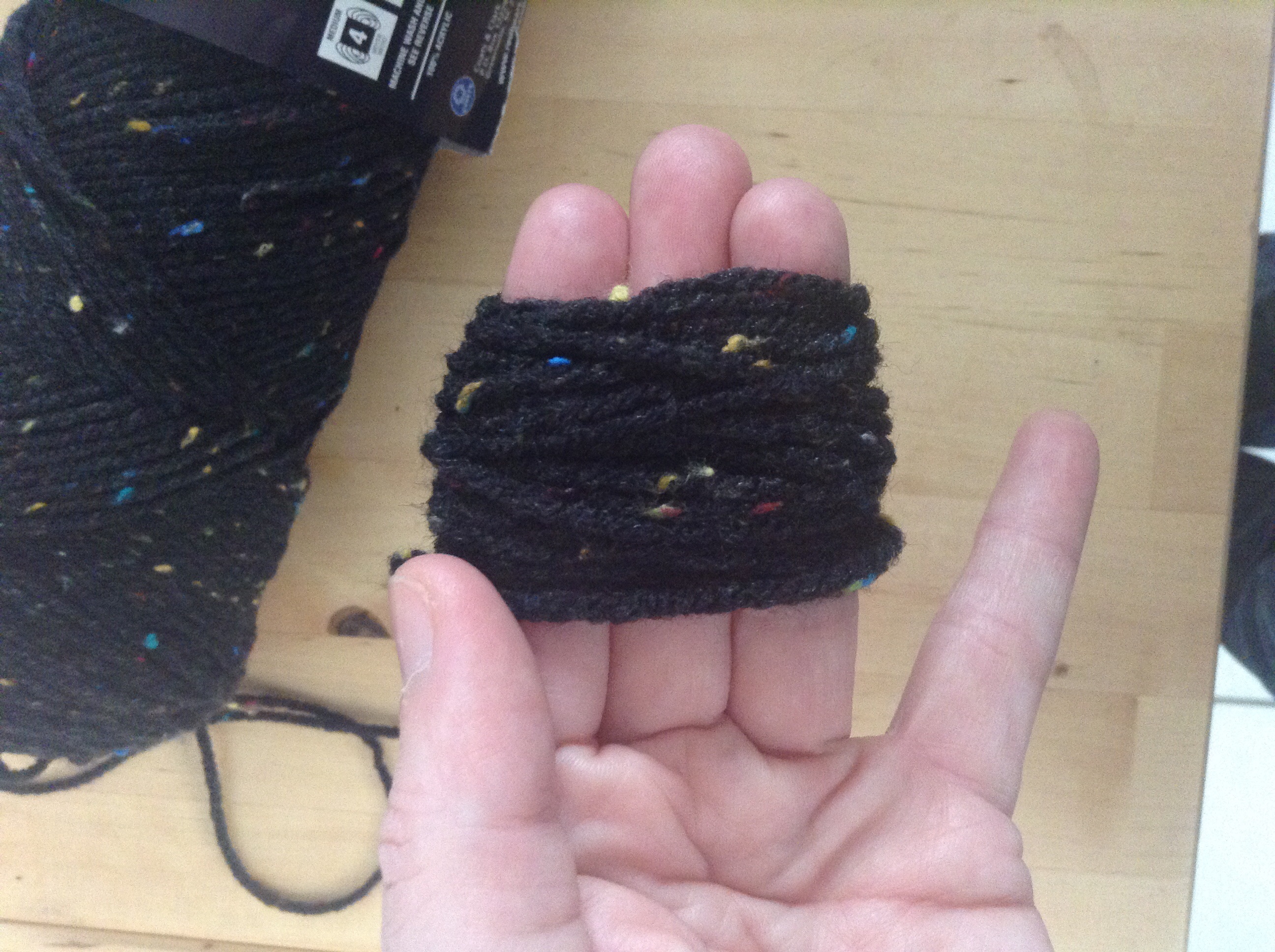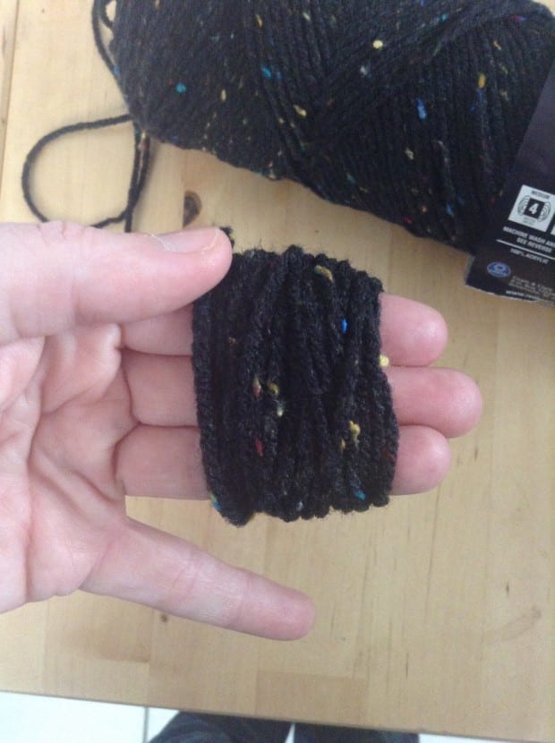 First, wind your yarn around three of your fingers, not so tight that it cuts your circulation off. ;) Make it a decent thickness so that you will have plenty of fluff on each pom. The thicker the yarn, the less thickness you have to wind around.