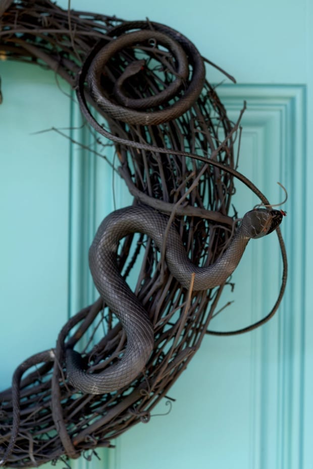 I spray painted my wreath and snakes, but be forewarned that it doesn’t do well on rubber snakes. It kept sticking to my fingers even days later. I just wrapped my snakes in around the wreath and hung it up. So simple and so spooky!!