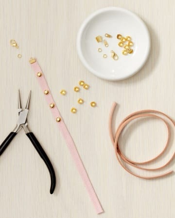 Press stud into strip, creating an indentation where each spike will go. Use the tip of your craft knife to pierce the leather at each of these marks. Push stud through at these marks, closing spikes around leather with your needle-nose pliers. Squeeze with nylon jaw pliers to secure studs.