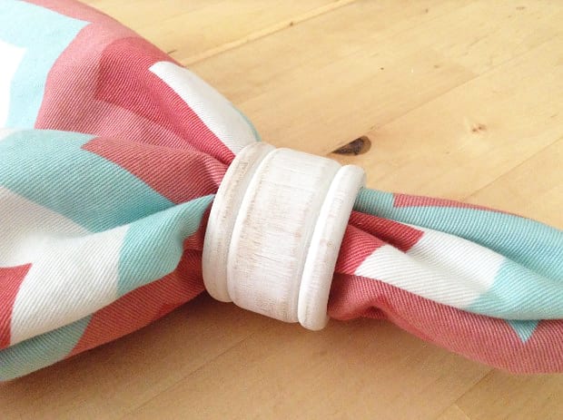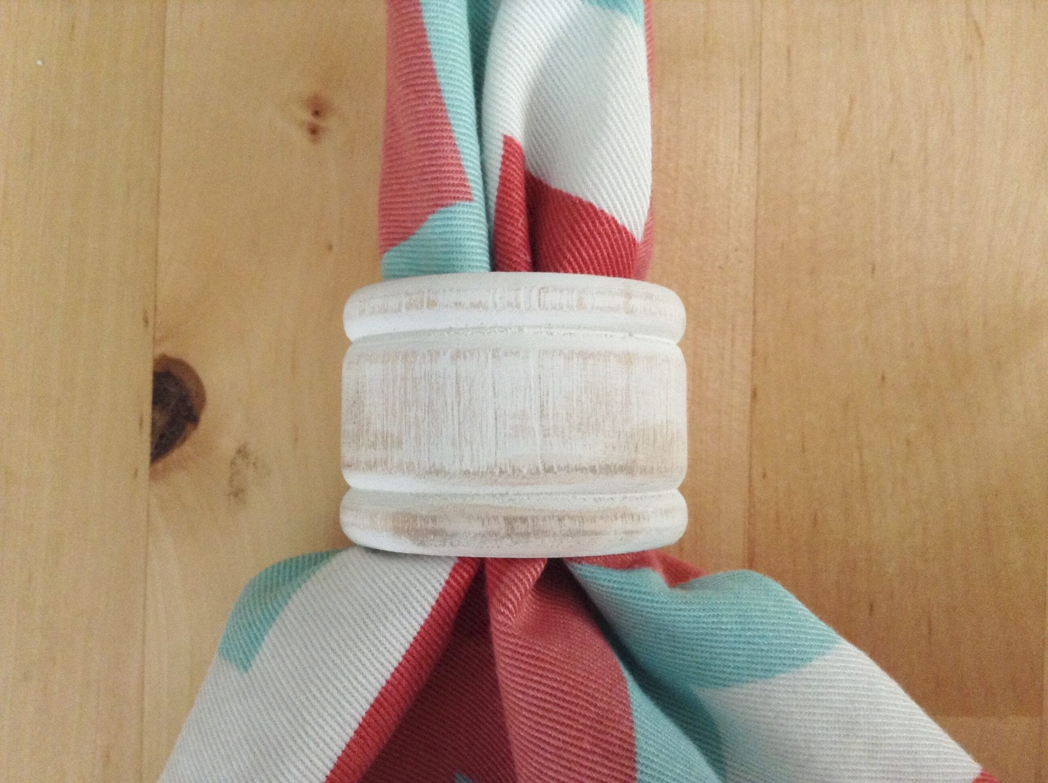 While you are waiting on that, go ahead and paint your napkin rings white. Once they are thoroughly dry, use a fine grit sanding block (or paper) and scuff it up in areas all over. Once a few days has passed, dab a clean, lint-free cloth in the mixture and lightly dab the scuffed areas with the mixture then wipe away with a clean area of the cloth. It will darken and create that aged look.