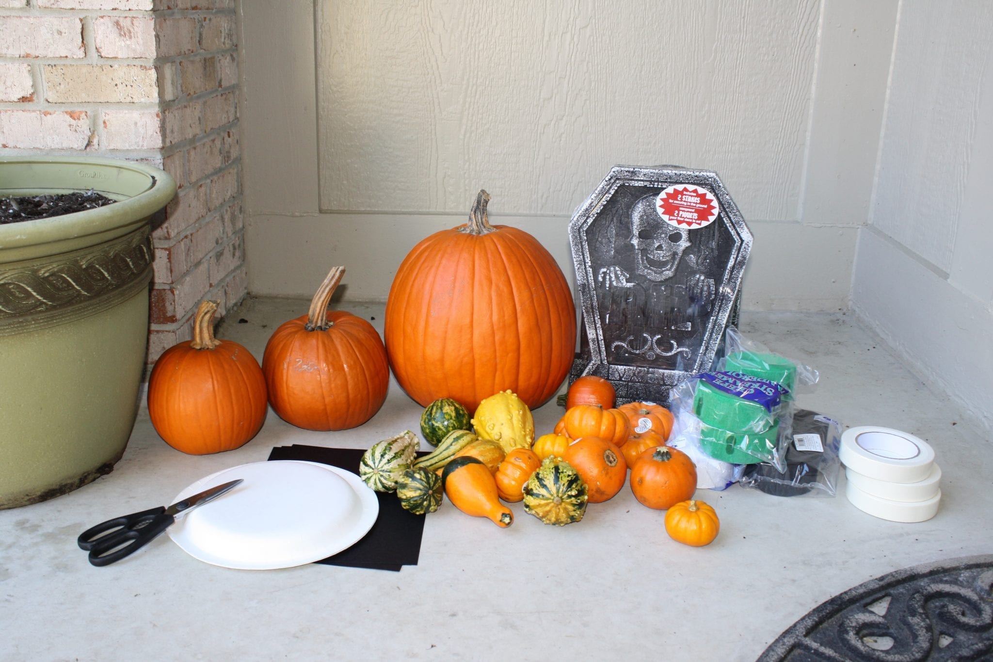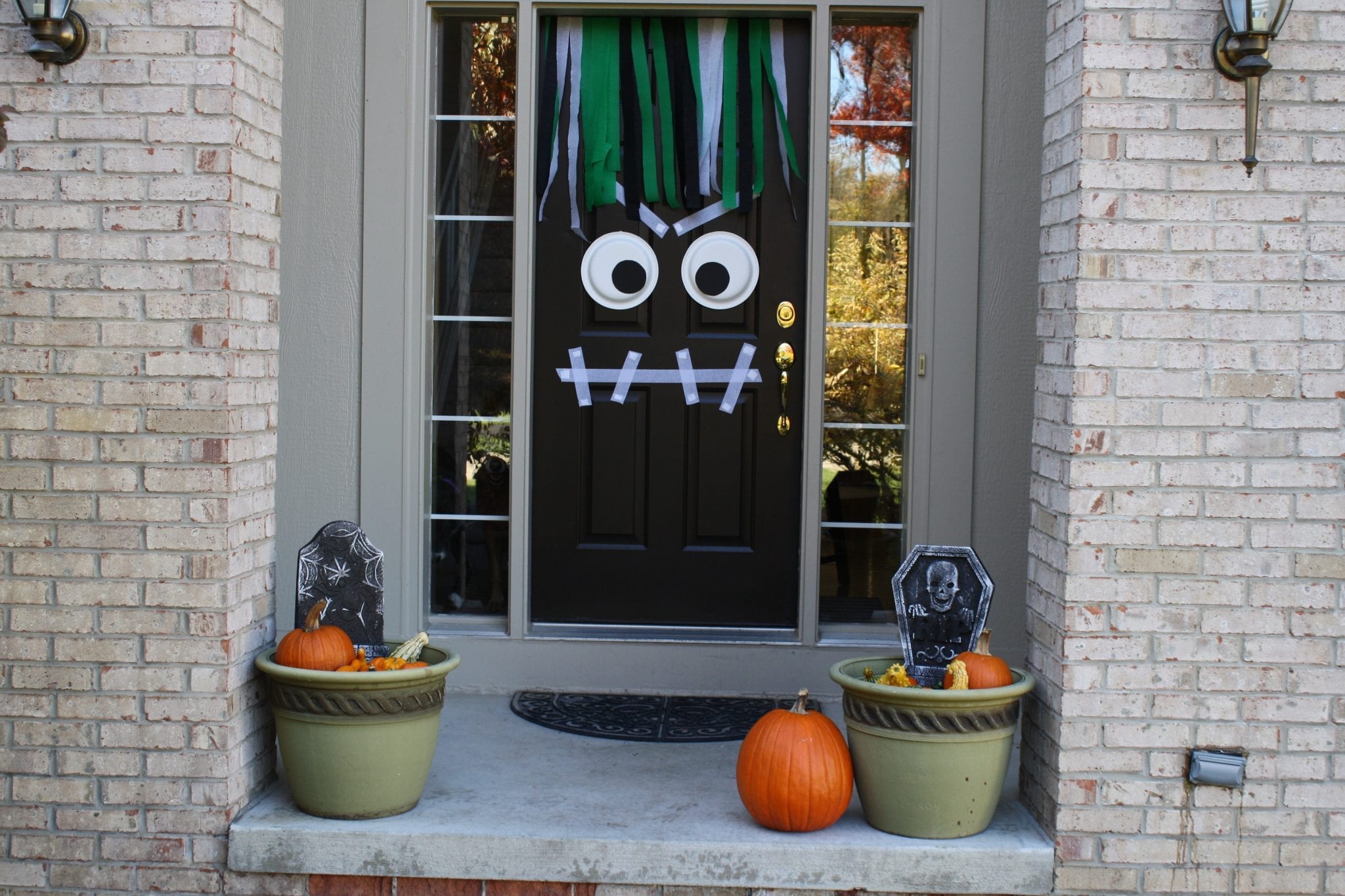 Add pumpkins, gourds and decorations to your flower pots on the porch and then create a Monster on the front door with the streamers and use the paper plates with the black circles for eyes.