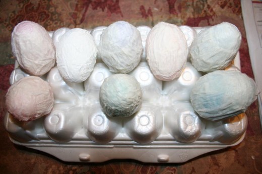 Hold your egg in one hand, and place one piece of crepe paper on the egg. Brush the glue mixture on and repeat until the egg is covered. The easiest way I found to do this is to hold the egg upright; place 4 strips vertically around the egg, then cover both the top and bottom with 3 to 4 strips in an x pattern and the finish up by applying 3-4 strips horizontally around the middle of the egg. After you do the first one, you’ll fall into a pattern and figure out the best way it works for you.