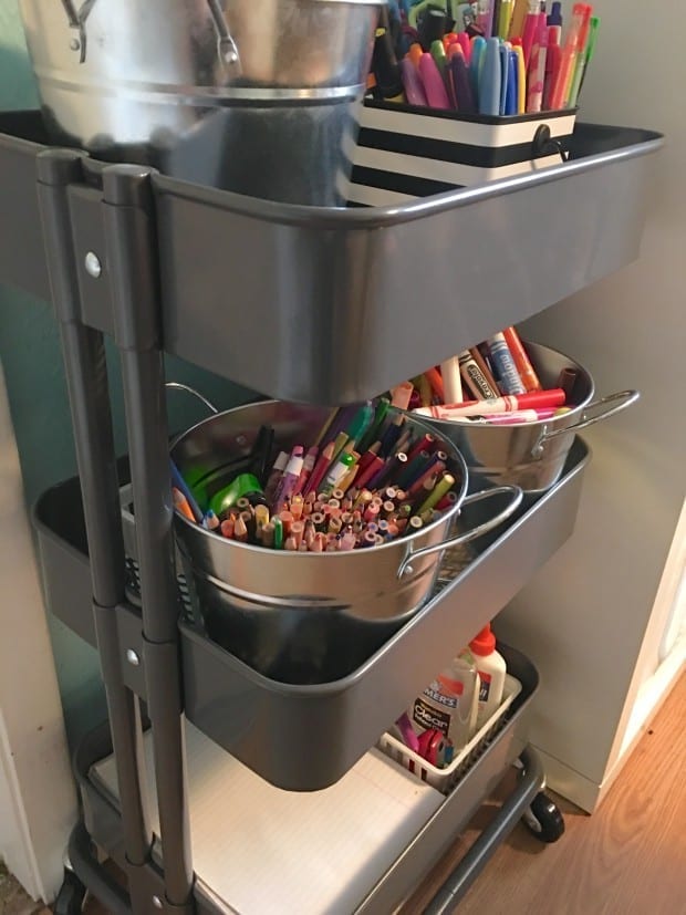My daughter is a crafty little thing. With that comes many crayons, colored pencils, markers, various glues, scissors, you name it. Before I decided to really tackle this project and organize it a little better, we were using those cloth bins and clear boxes to store everything in. The only problem with that was that it invited her to just throw everything in there since nothing really had a place.