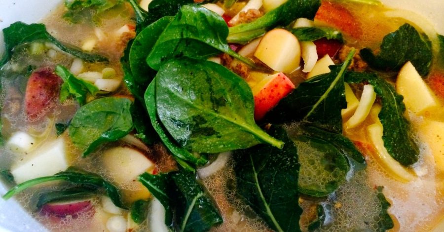 5. Add in sausage and greens (kale & spinach) and stir all together